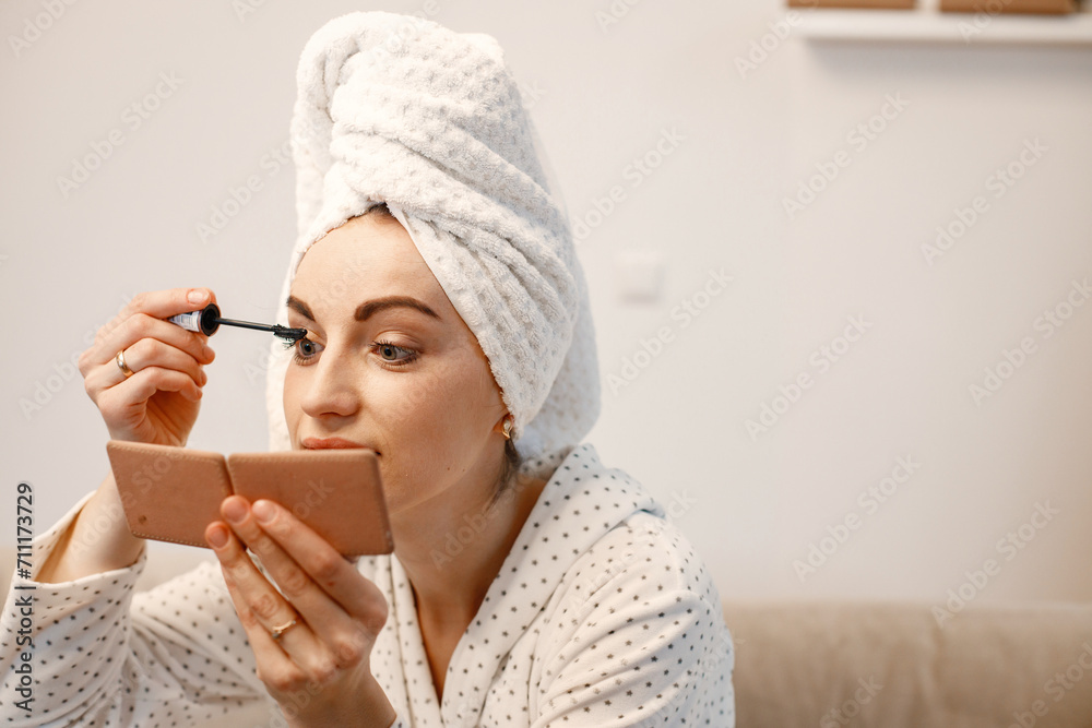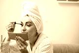 Woman wearing dressing gown and has a towel on her hair doing a make up