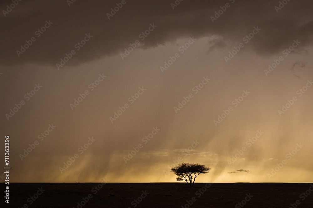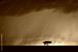 Single tree in the middle of big storm in background with dark clouds