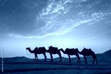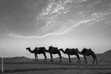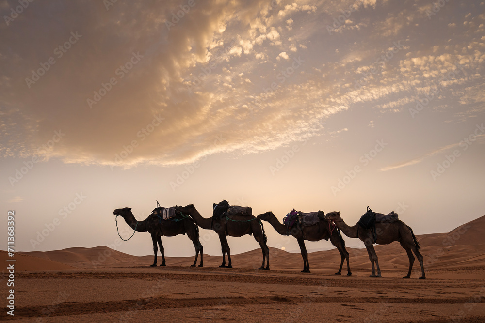Camel caravan between beautiful dunes of desert in Sahara, Merzouga, Morocco