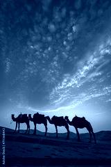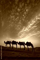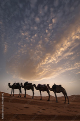 Camel caravan between beautiful dunes of desert in Sahara, Merzouga, Morocco