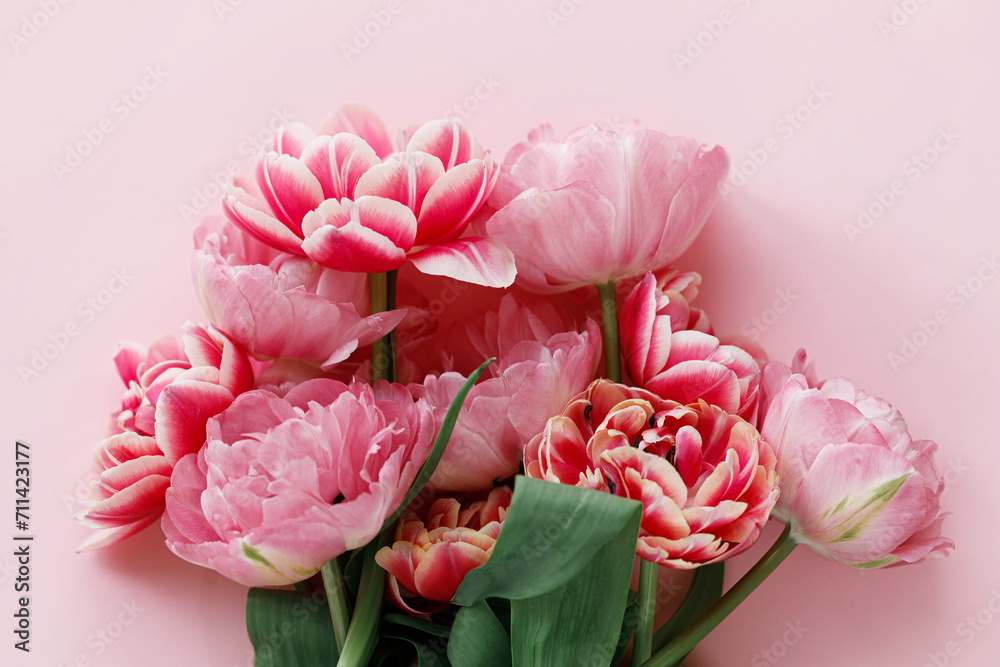 Beautiful tulips flat lay on pink background. Stylish floral composition. Happy Valentines day and happy mother's day. Tender pink and red flowers wallpaper