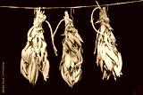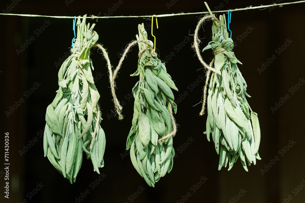 Bunch of green sage leaves drying on air. Herbs for medicine, aromatherapy and fumigation