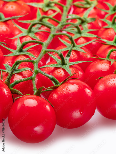 Lot of red cherry tomato branches covered with small water drops isolated on white background.