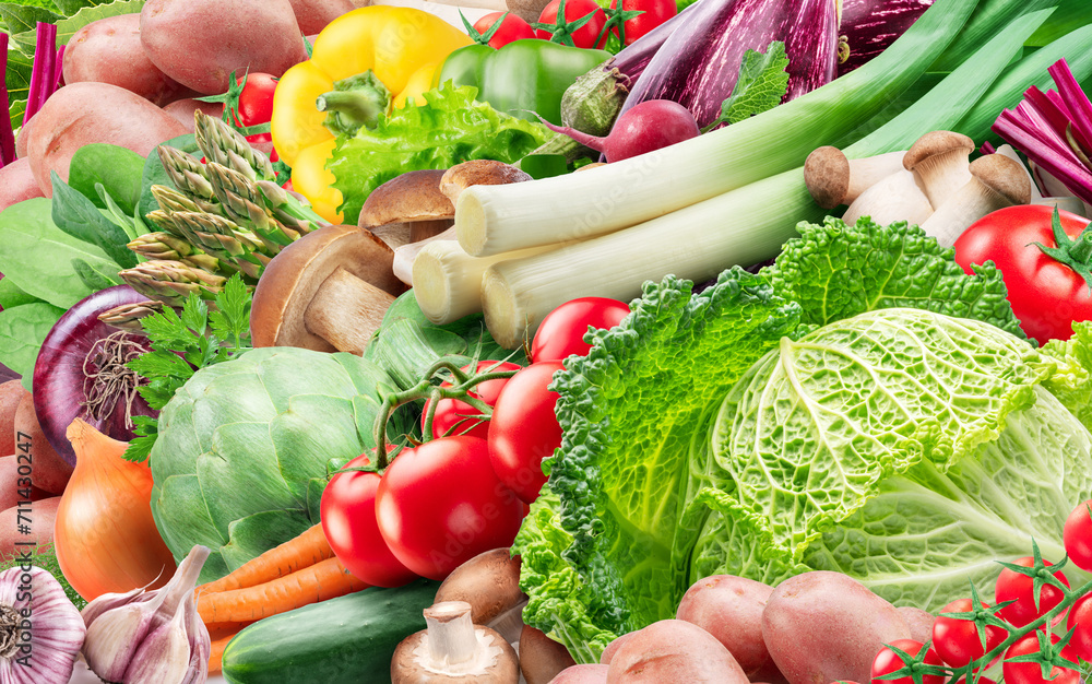 Plenty of fresh organic vegetables and herbs close-up. Food background.