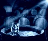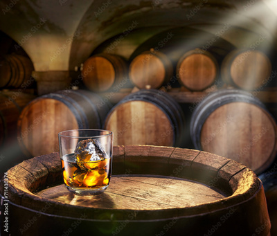 Glass of whiskey on top of wooden barrel and wood barrels in cellar at the background. Sun ray falling down on it surface.