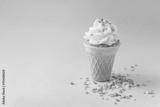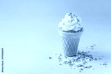 Ice cream cone cake with frosting on blue background front view with copy space