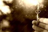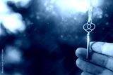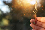 Male hand holding golden key with glowing light. Concept of success and wealth
