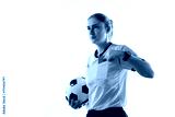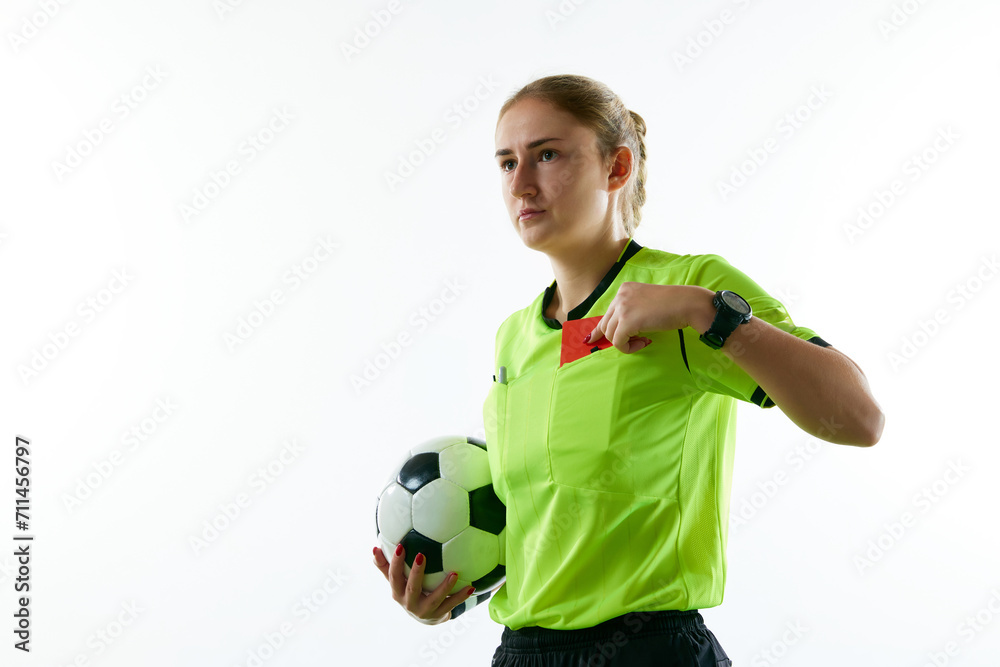 Young woman, female soccer referee holding ball, stopping game and showing red card against white studio background. Concept of sport, competition, match, profession, football game, control