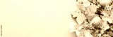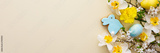 Festive banner with spring flowers and naturally colored eggs and Easter bunnies, white daffodils and cherry blossom branches on a yellow pastel background