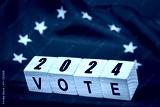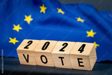 European Union vote, the word Vote on wooden blocks against the background of the EU flag, the concept of voting and taking part in the European elections