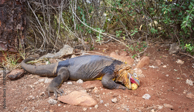 Galapagos land iguana eating the fruit of an Opuntia echios, Galapagos Islands, Ecuador.