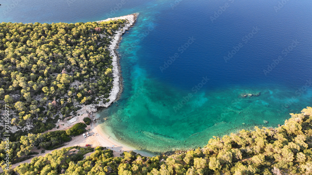 Aerial drone photo of scenic volcanic island rocky bay full of pine trees and beautiful emerald crystal clear sea in tropical exotic destination