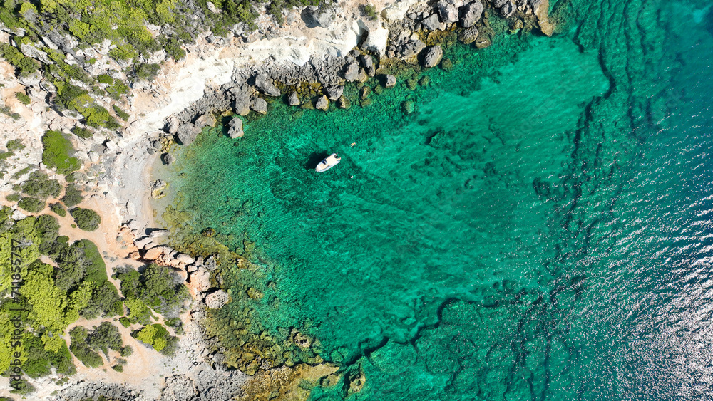 Aerial drone photo of not so famous but paradise secluded sterna beach with crystal clear emerald sea near iconic lake Vouliagmenis, Loutraki, Greece