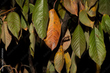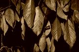 Red leaves of a cherry tree on a black background. Withering flora in autumn.