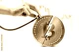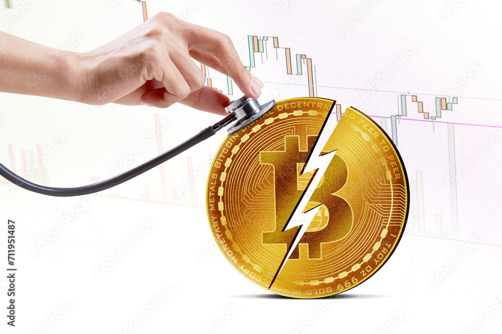 Close up of hands using stethoscope to checking bitcoin