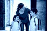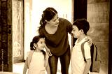 Mother instructs her son on good behavior to follow on his first day of school at school.
