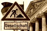 Flagge von Deutschland, Reichstaggebäude im Berlin und Schild Baustelle Gesellschaft