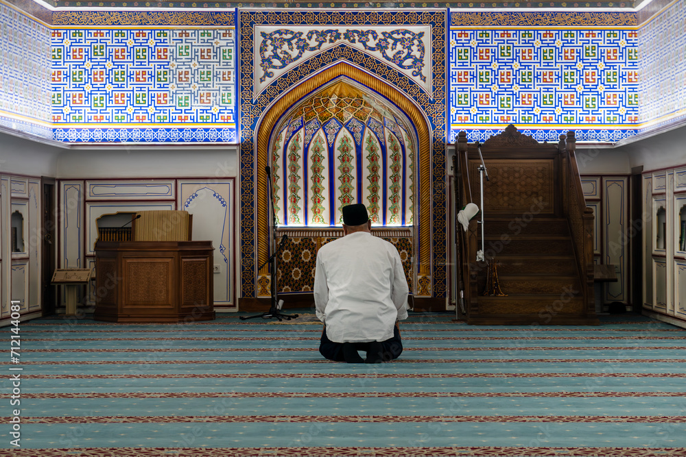 Back view of a Muslim man's while he prays in mosque. Prayer inside a beautiful old Uzbek mosque