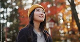 Woman, forest and travel in Kyoto, garden and tourist with happiness, traditional history and sightseeing. Nature, japanese and explore in woods with trees, adventure and holiday walk in autumn