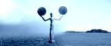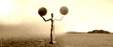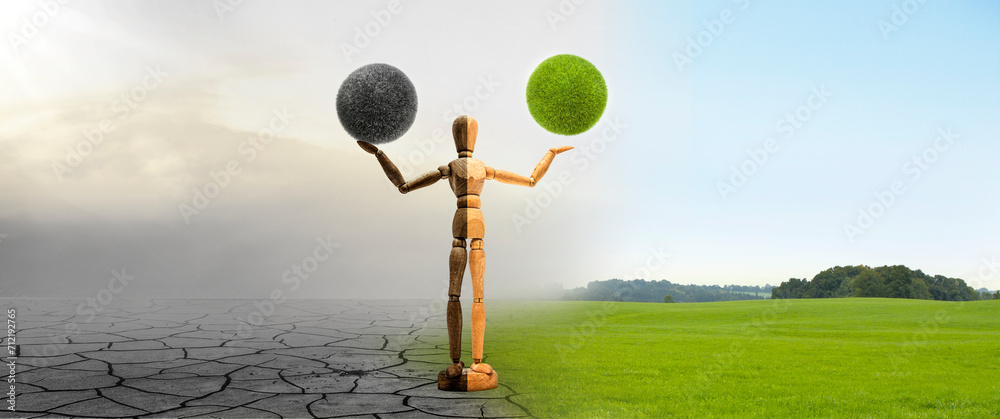 Holzfigur mit Grauer und Grüner Graskugel im Kilmawandel