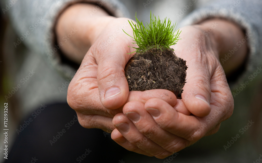 Erde mit Gras in den Handen einer Seniorin