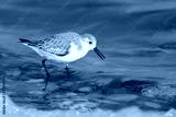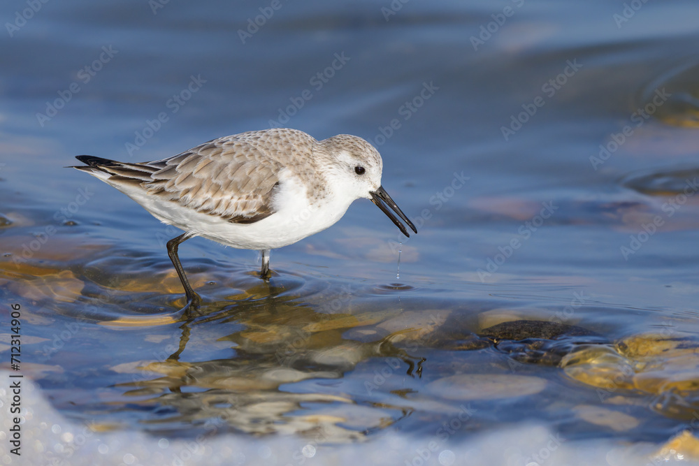 A Sanderling running along the shore of the sea