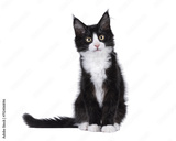 Cute black with white tuxedo Maine Coon cat kitten with naughty expression, sitting up facing front. Looking towards camera. Isolated cutout on a transparent background.