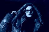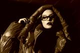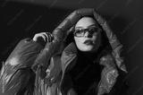 Fashionable confident woman wearing trendy oversized red puffer down jacket with hood, y2k sunglasses, black classic turtleneck, posing on red background. Close up studio fashion portrait