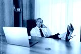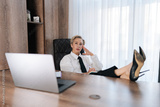 Portrait of confident middle-aged female CEO putting legs on desk with laptop, confident looking at camera. Successful business woman relaxing in cabinet. Concept relaxation at workplace