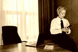 Side view of elegant middle-aged business woman using typing smartphone searching info sitting on office desk. Female entrepreneur holding cellphone, texting message, using business app, typing email.