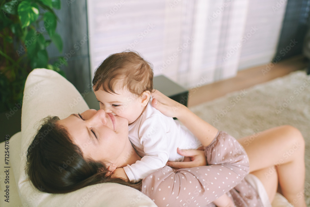 Indoor portrait of happy young mother playing with adorable baby, biting child, teething time
