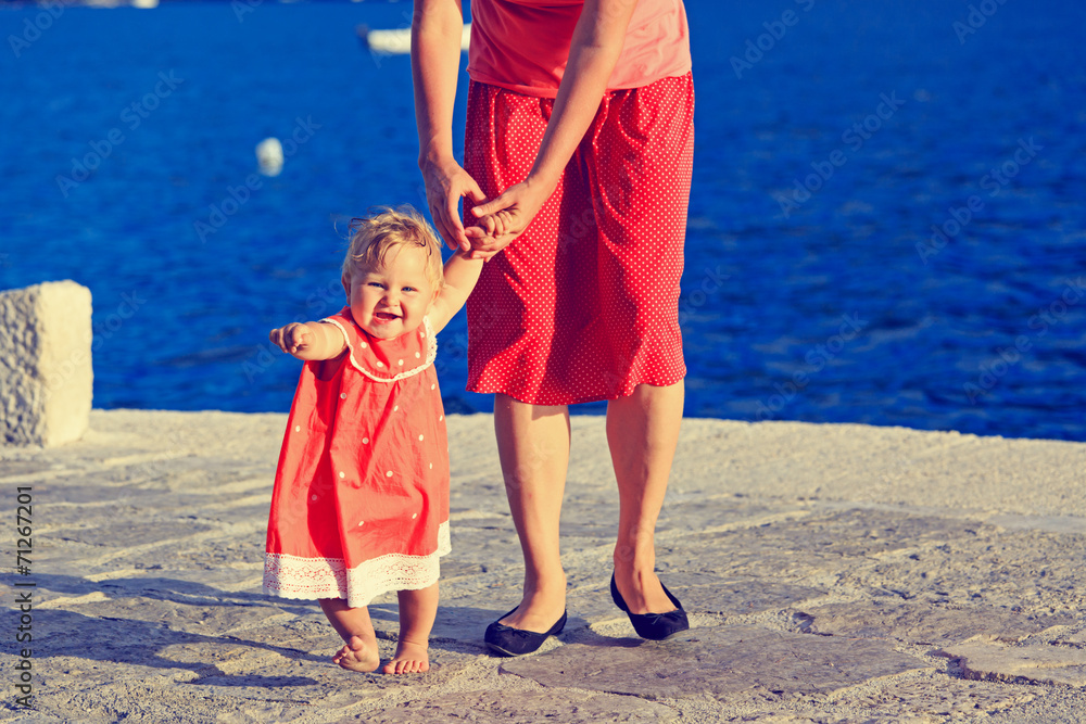 little girl making first steps at the sea