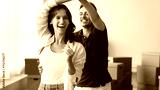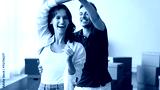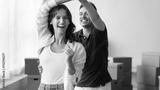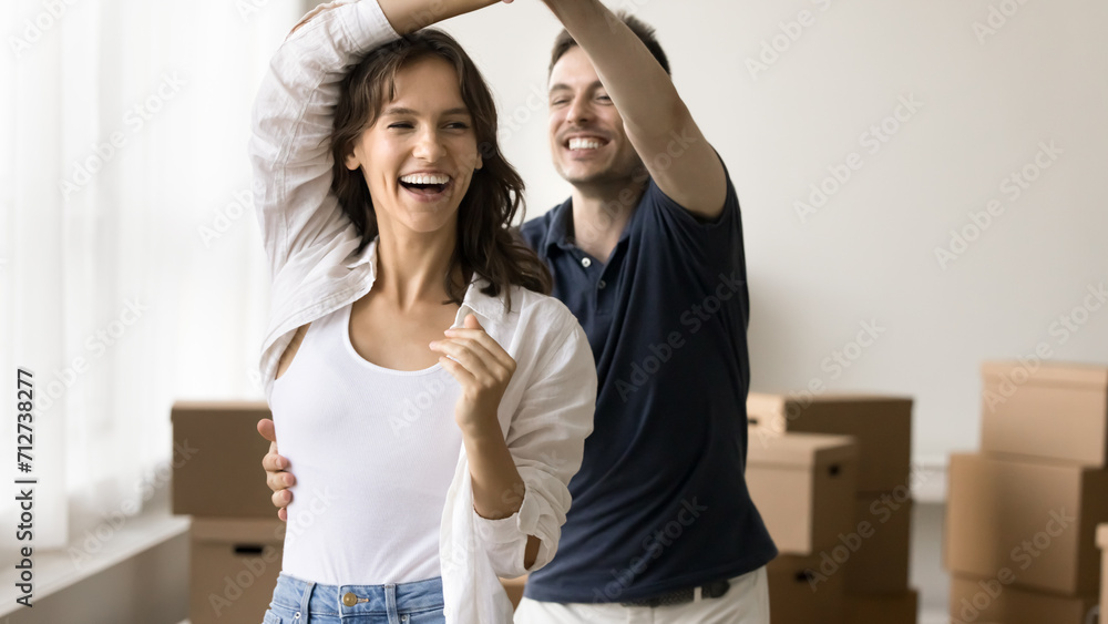 Cheerful young couple enjoying moving into new house, dancing in empty room with cardboard transportation boxes in background, laughing, smiling, having fun at relocation party. Banner shot