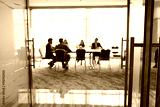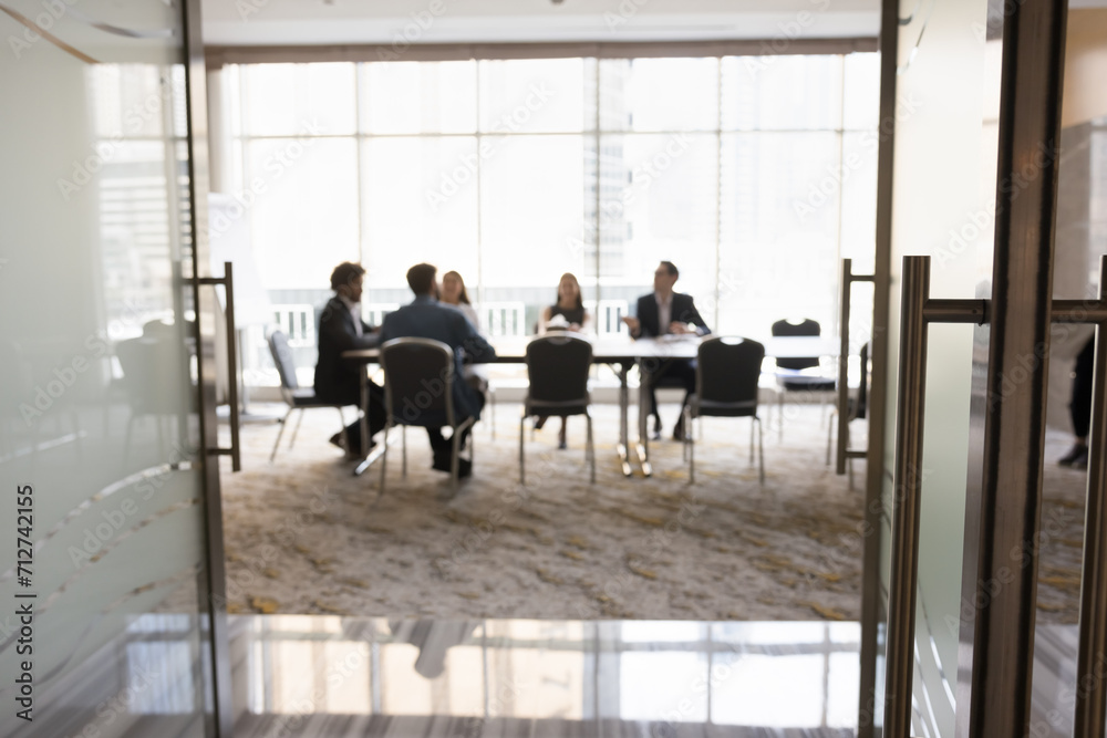 Group of businesspeople sitting at large conference table in negotiation room. Project partners brainstorming on ideas, discussing collaboration terms, teamwork. Business meeting blurred background