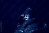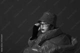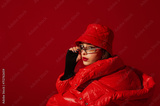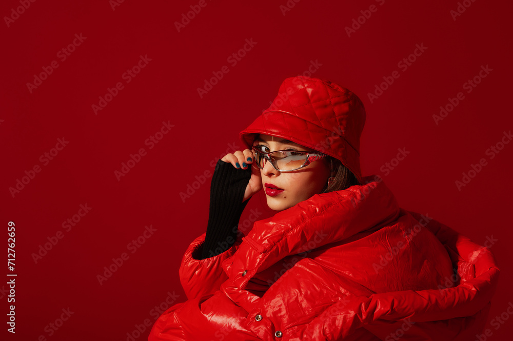 Fashionable confident woman wearing trendy y2k style silver glasses, quilted faux leather bucket hat, puffer jacket, posing on red background. Close up studio fashion portrait. Copy, empty space