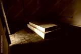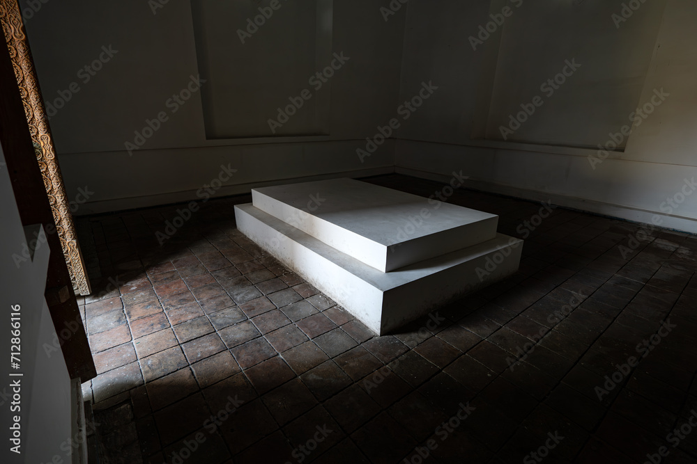 white tombstone inside an ancient crypt in the old city of Samarkand, Uzbekistan. The world famous Shahi Zinda complex