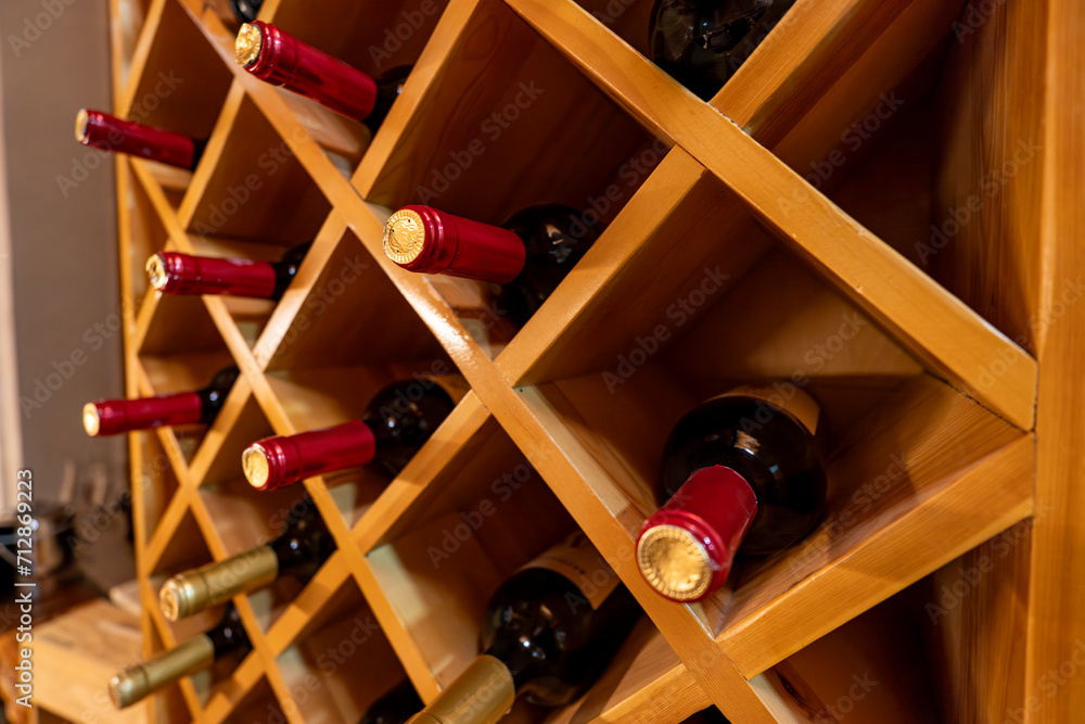 Wine bottles in wine store. lots of bottles of wine on the shelf in the restaurant.