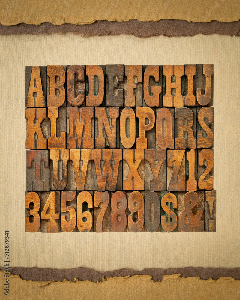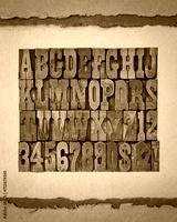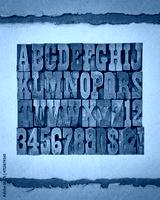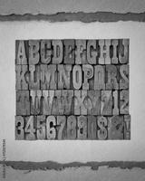 letters and numbers in vintage letterpress wood type on art paper, alphabet in French clarendon typeset
