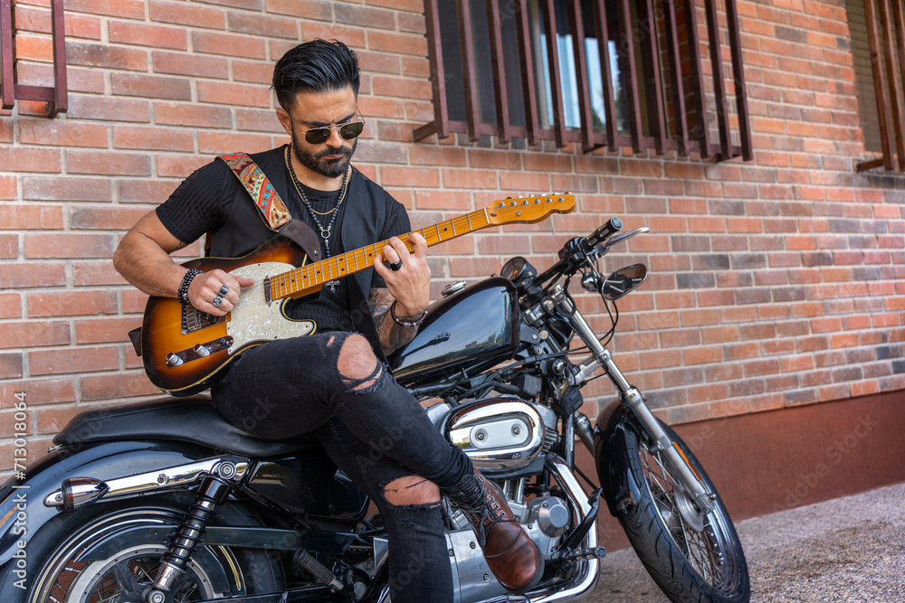 Hipster guitarist playing electric guitar on his motorcycle. Grunge style.