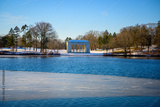 Floating ice plate, bare trees, and Temple to Music over the Cunliff Lake in Roger Williams State Park, Providence, Rhode Islands, USA