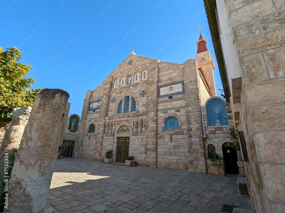 Madaba historical old town, Jordan, fampous for Interior of Greek Orthodox Basilica of St George with the mosaic map of Holy Land
