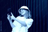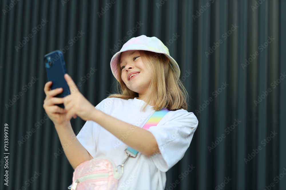 Young girl taking a summer selfie, capturing nature's beauty with smartphone