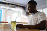 Young African American businessman working on a laptop in a modern office or cafe, exuding confidence and professionalism.