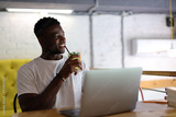 Happy young businessman using a laptop, exuding professionalism and happiness in a modern work or home setting.