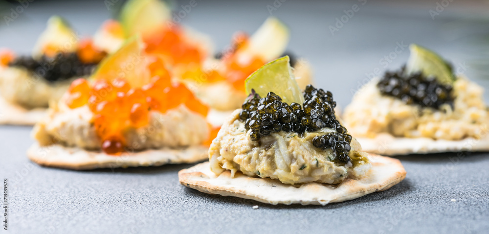 Holiday canapes with red and black caviar, on crackers festive silver Christmas decoration, copy space, selected focus, narrow depth of field