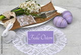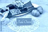 Frohe Ostern: Besteck mit Teller und Oster Dekoration auf einem Tisch