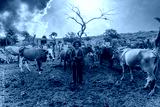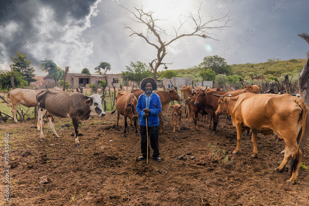 old farmer herding his cattle into the kraal late afternoon, village in south africa