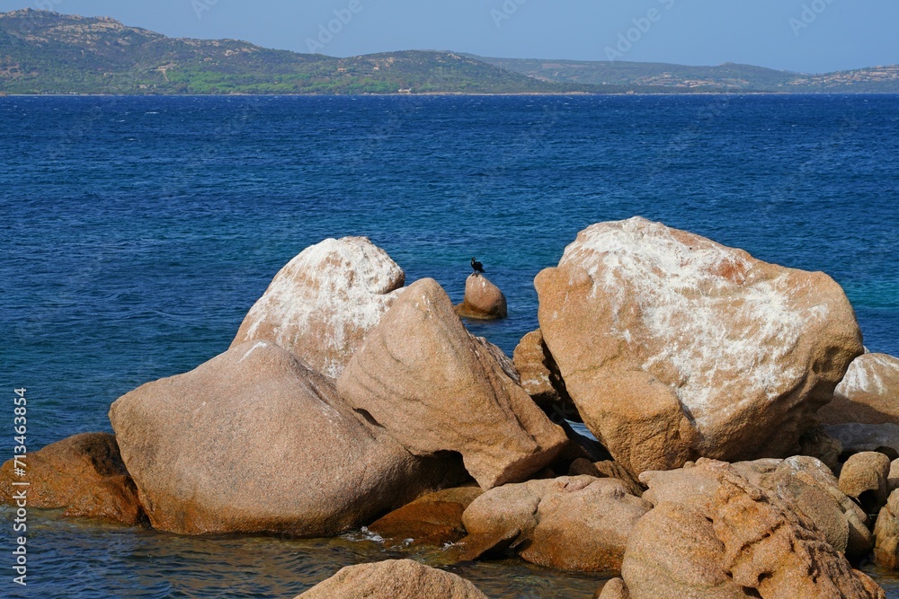 View of the sea and shoreline near Baja Sardinia on the (Emerald Coast), an exclusive coastal destination in Northern Sardinia on the Tyrrhenian Sea