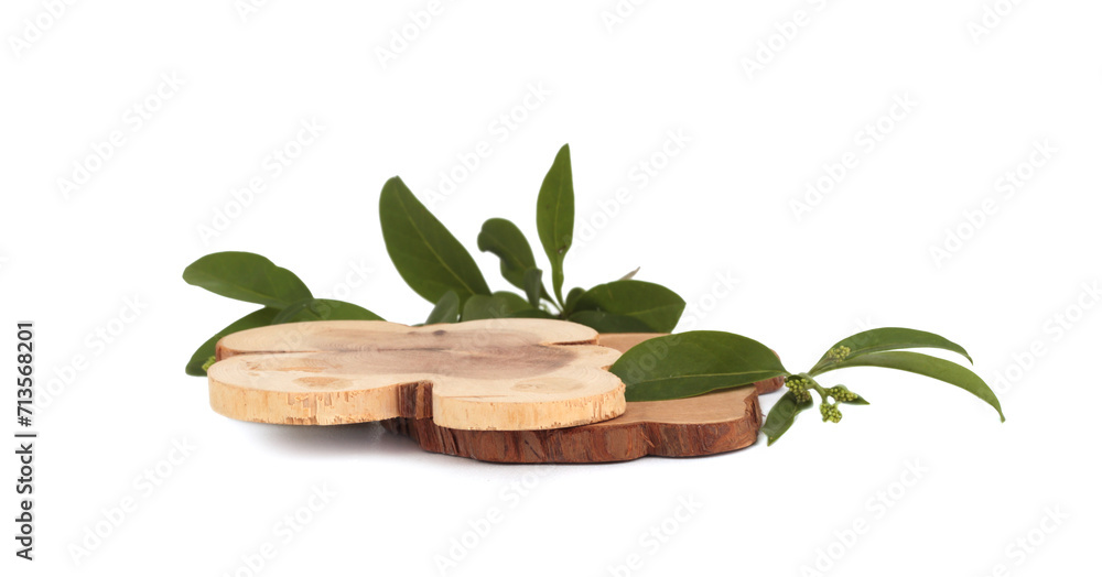 Wooden stump eco rustic platform podium on white background. Minimal empty display product presentation scene.