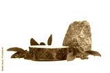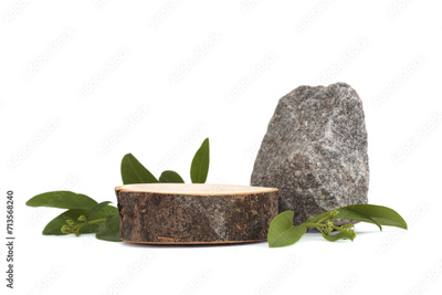 Wood stump and stone platform podium on white background. Minimal empty display product presentation scene.